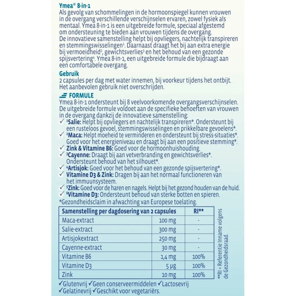 Ymea 8-in-1 is een voedingssupplement met een combinatie van vitaminen, mineralen en natuurlijke extracten. Een gezonde levensstijl is belangrijk, evenals een gevarieerde, evenwichtige voeding, waarvoor voedingssupplementen geen vervanging zijn.