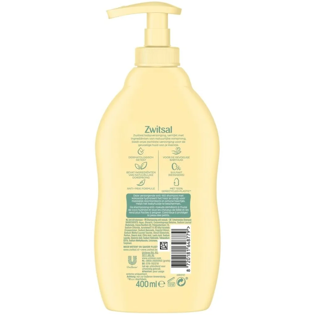 Zwitsal streeft naar een circulaire economie waarin we zoveel mogelijk plastic verpakkingen hergebruiken of recyclen. Waar mogelijk vermijdt Zwitsal het gebruik van plastic. Als er nog geen kwalitatief goed alternatief beschikbaar is, gebruiken ze minder plastic of beter plastic. De fles van deze shampoo is gemaakt van 100% gerecycled plastic.*