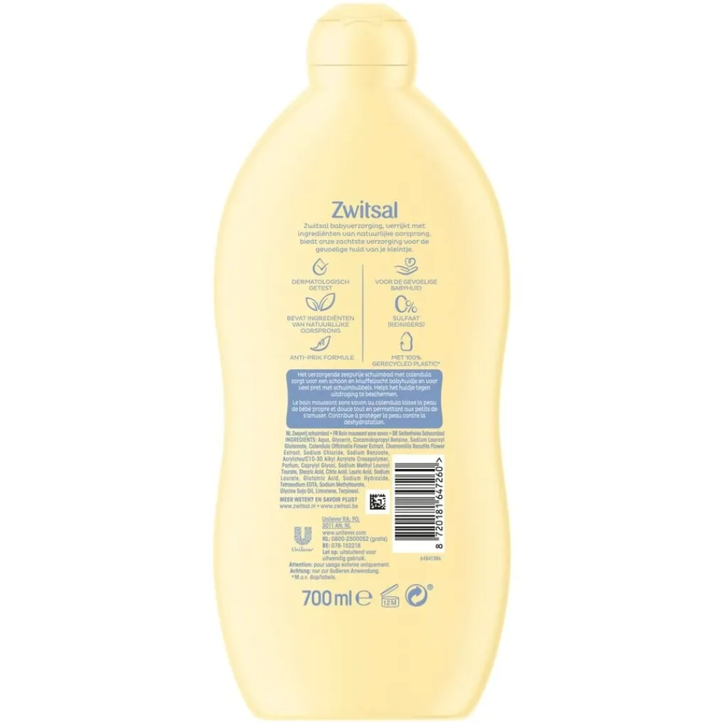 Zwitsal streeft naar een circulaire economie waarin ze zoveel mogelijk plastic verpakkingen hergebruiken of recyclen. Waar mogelijk vermijden ze het gebruik van plastic. Als er nog geen kwalitatief goed alternatief beschikbaar is, gebruiken ze minder plastic of beter plastic. De fles van dit zeepvrije schuimbad is gemaakt van 100% gerecycled plastic.*